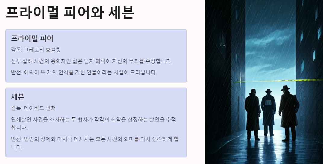 반전 영화를 처음 접하는 분들에게는 '식스 센스'와 '세븐'을 추천합니다. 이 두 작품은 스토리 전개가 뛰어나고, 반전의 충격이 강렬해 영화 경험을 풍부하게 해줄 것입니다.