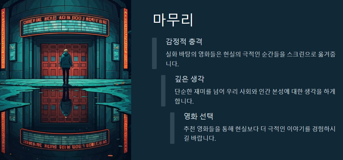 실화 바탕의 영화들은 현실의 극적인 순간들을 스크린으로 옮겨, 관객에게 강한 감정적 충격을 안깁니다. 이 글에서 추천한 영화들을 통해 현실보다 더 극적인 이야기를 경험하고, 감동적인 순간들을 만끽하시길 바랍니다. 실화 바탕의 영화는 단순히 재미를 넘어서, 우리 사회와 인간 본성에 대한 깊은 생각을 하게 만드는 기회를 제공합니다. 여러분의 영화 선택에 도움이 되기를 바랍니다!