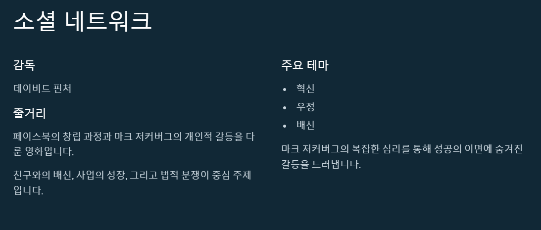 줄거리: 페이스북의 창립 과정과 마크 저커버그의 개인적 갈등을 다룬 영화로, 친구와의 배신, 사업의 성장, 그리고 법적 분쟁이 중심 주제입니다. 이 영화는 현대 사회의 소셜 미디어가 어떻게 우리의 삶을 변화시켰는지를 보여줍니다.