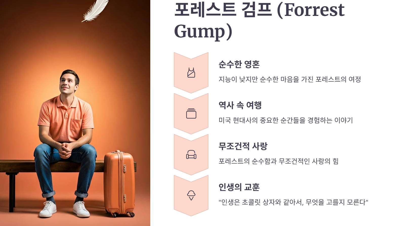 감동 포인트: 포레스트의 순수함과 무조건적인 사랑, 그리고 그가 전하는 "인생은 초콜릿 상자와 같아서, 무엇을 고를지 모른다"는 메시지가 많은 이들의 마음을 울립니다. 특히 제니의 무덤 앞에서 아들에게 말하는 마지막 장면은 큰 감동을 줍니다.