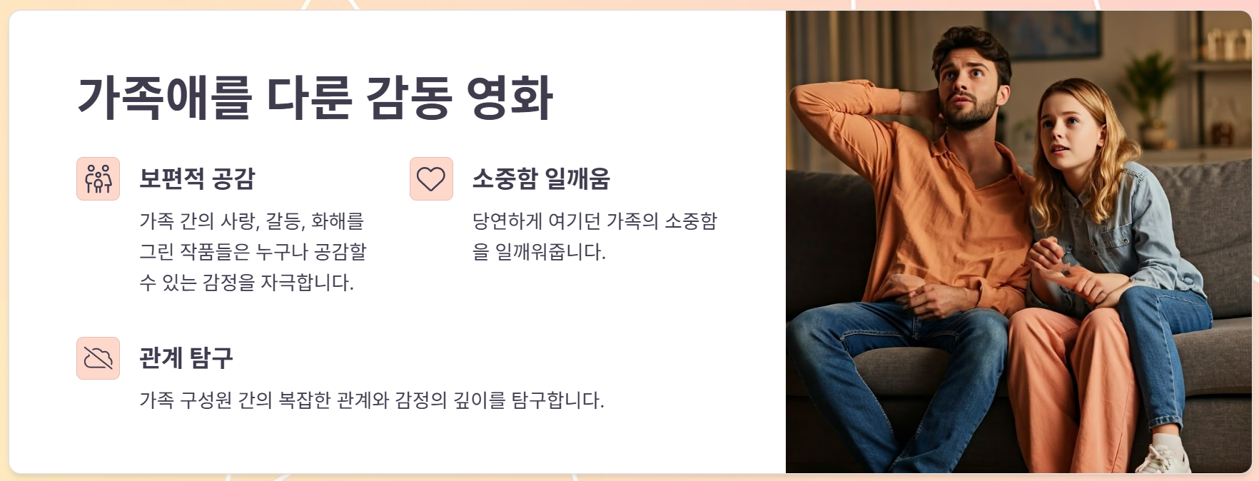 가족이라는 주제는 감동적인 영화에서 자주 등장하는 소재입니다. 가족 간의 사랑, 갈등, 화해를 그린 작품들은 누구나 공감할 수 있는 보편적인 감정을 자극합니다. 이러한 영화들은 가족의 의미를 되새기게 하고, 때로는 우리가 당연하게 여기던 가족의 소중함을 일깨워줍니다. 가족애를 다룬 영화들은 단순한 눈물을 넘어서, 가족 구성원 간의 복잡한 관계와 감정의 깊이를 탐구합니다. 이를 통해 관객들은 자신의 가족 관계를 돌아보고, 더 깊은 이해와 사랑을 나누게 됩니다.