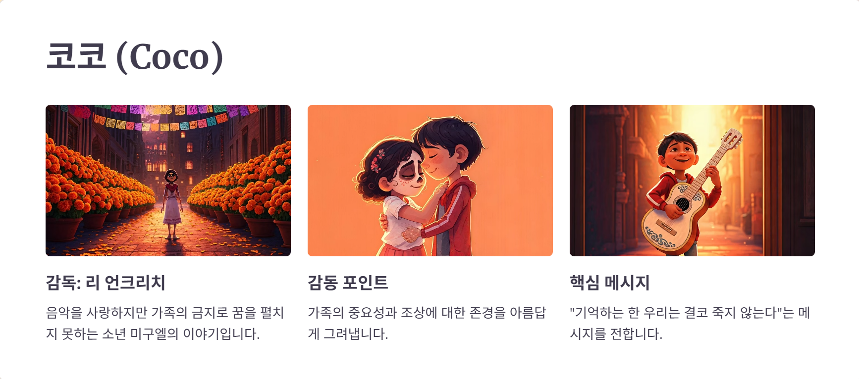 감동 포인트: 가족의 중요성과 조상에 대한 존경을 아름답게 그려낸 이 작품은 '기억하는 한 우리는 결코 죽지 않는다'는 메시지를 전합니다. 특히 마지막 장면에서 할머니 코코와 미구엘이 함께 부르는 '리멤버 미'는 많은 관객들의 눈물을 자아냅니다.