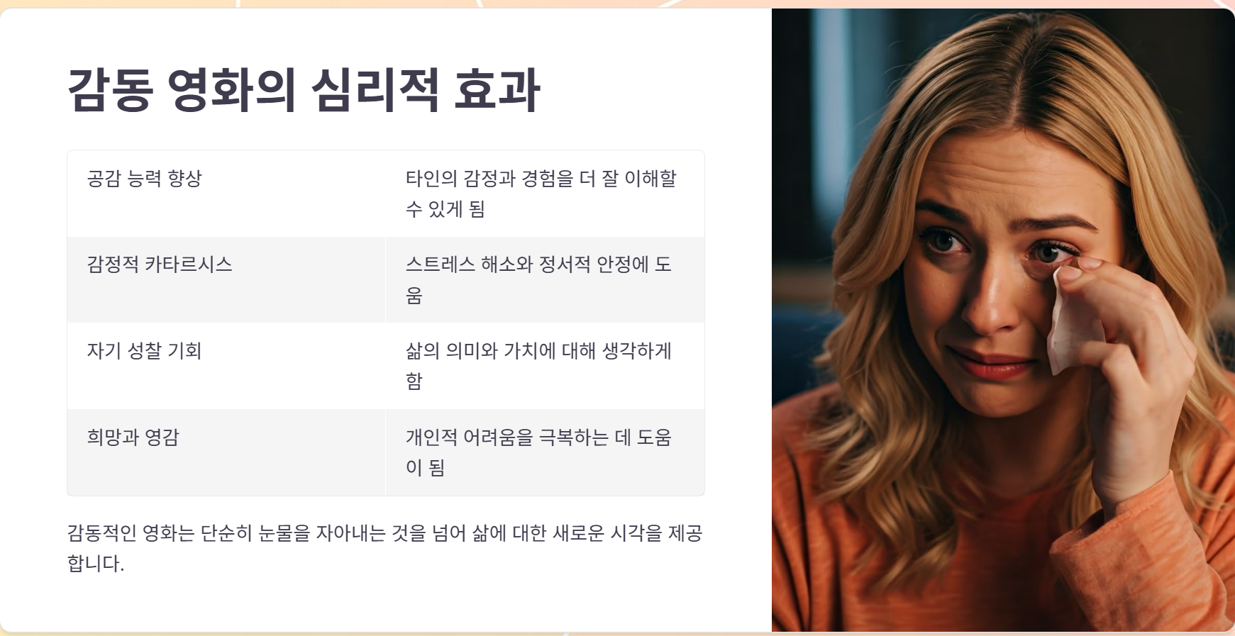 감동적인 영화는 여러 심리적 효과를 제공합니다. 첫째, 공감 능력을 향상시켜 타인의 감정과 경험을 더 잘 이해할 수 있게 합니다. 둘째, 감정적 카타르시스를 통해 스트레스 해소와 정서적 안정에 도움을 줍니다. 셋째, 삶의 의미와 가치에 대해 생각하게 하여 자기 성찰의 기회를 제공합니다. 넷째, 희망과 영감을 주어 개인적 어려움을 극복하는 데 도움이 될 수 있습니다.
