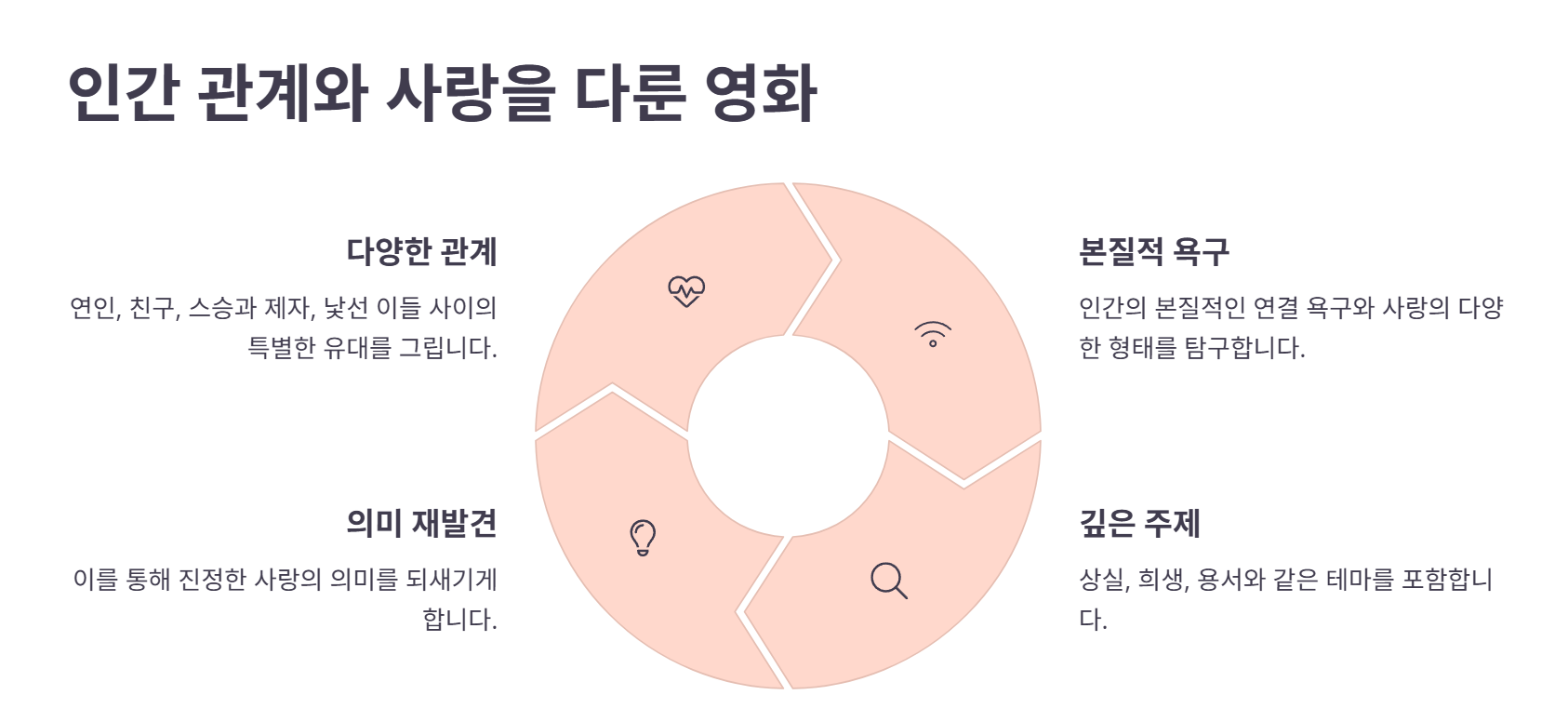 인간 관계와 사랑은 감동 영화의 핵심 주제 중 하나입니다. 이러한 영화들은 연인 간의 사랑뿐만 아니라, 친구, 스승과 제자, 낯선 이들 사이의 특별한 유대 관계를 그려냅니다. 이러한 관계를 통해 인간의 본질적인 연결 욕구와 사랑의 다양한 형태를 탐구합니다. 사랑과 관계를 다룬 영화들은 종종 상실, 희생, 용서와 같은 테마를 포함하며, 이를 통해 진정한 사랑의 의미를 되새기게 합니다.