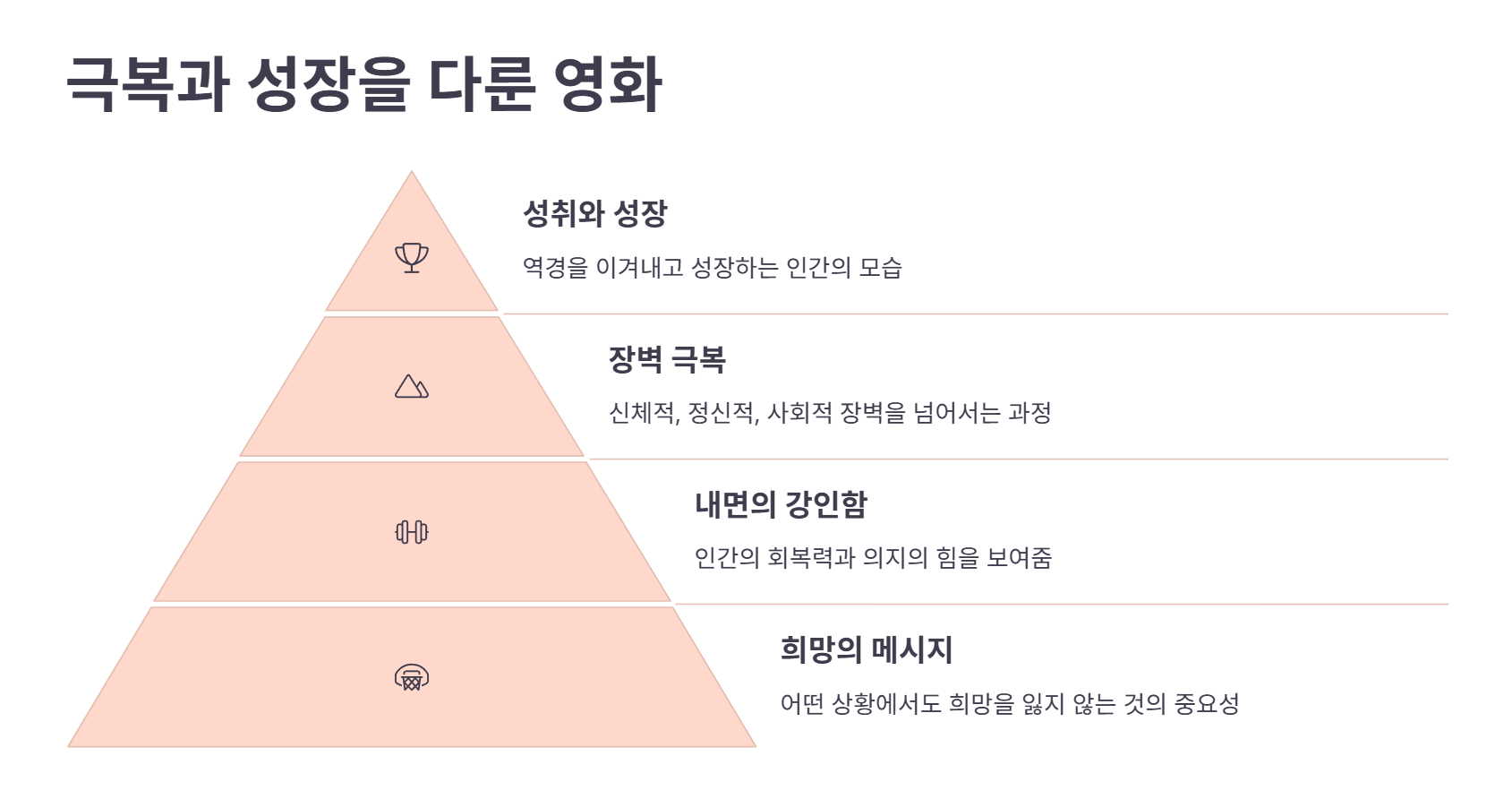 인간의 성장과 역경 극복을 다룬 영화들은 관객에게 희망과 용기를 전달합니다. 이러한 작품들은 주인공이 신체적, 정신적, 사회적 장벽을 넘어서는 과정을 그리며, 인간의 회복력과 의지의 힘을 보여줍니다. 극복과 성장을 다룬 영화들은 우리 모두가 가진 내면의 강인함을 일깨우고, 어떤 상황에서도 희망을 잃지 않는 것의 중요성을 강조합니다.