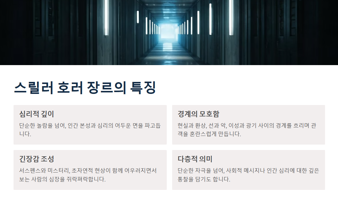 스릴러와 호러가 결합된 영화는 단순한 놀람을 넘어, 인간 본성과 심리의 어두운 면을 파고듭니다. 이러한 작품들은 종종 현실과 환상, 선과 악, 이성과 광기 사이의 경계를 흐리며 관객을 혼란스럽게 만듭니다. 서스펜스와 미스터리, 초자연적 현상이 함께 어우러지면서 보는 사람의 심장을 쥐락펴락하는 긴장감을 제공합니다. 스릴러 호러 영화는 단순한 자극을 넘어, 사회적 메시지나 인간 심리에 대한 깊은 통찰을 담기도 하며, 여러 번 감상할수록 새로운 의미를 발견할 수 있습니다.