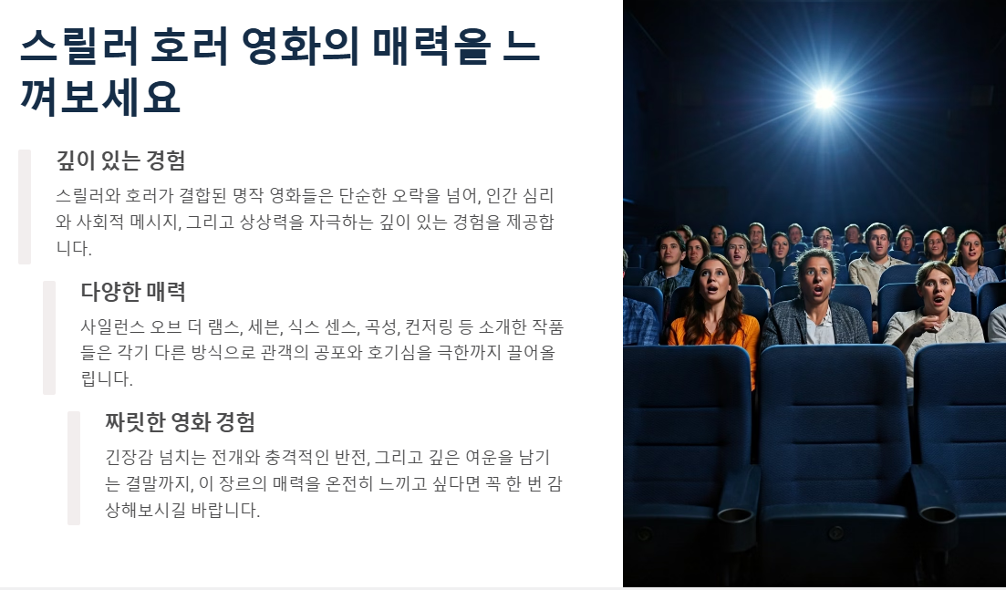 스릴러와 호러가 결합된 명작 영화들은 단순한 오락을 넘어, 인간 심리와 사회적 메시지, 그리고 상상력을 자극하는 깊이 있는 경험을 제공합니다. 사일런스 오브 더 램스, 세븐, 식스 센스, 곡성, 컨저링 등 이 글에서 소개한 다섯 편의 작품들은 각기 다른 방식으로 관객의 공포와 호기심을 극한까지 끌어올립니다. 긴장감 넘치는 전개와 충격적인 반전, 그리고 깊은 여운을 남기는 결말까지, 이 장르의 매력을 온전히 느끼고 싶다면 꼭 한 번 감상해보시길 바랍니다. 공포와 서스펜스, 그리고 인간 본성에 대한 탐구가 어우러진 최고의 스릴러 호러 영화들과 함께 짜릿한 영화 경험을 즐겨보세요!