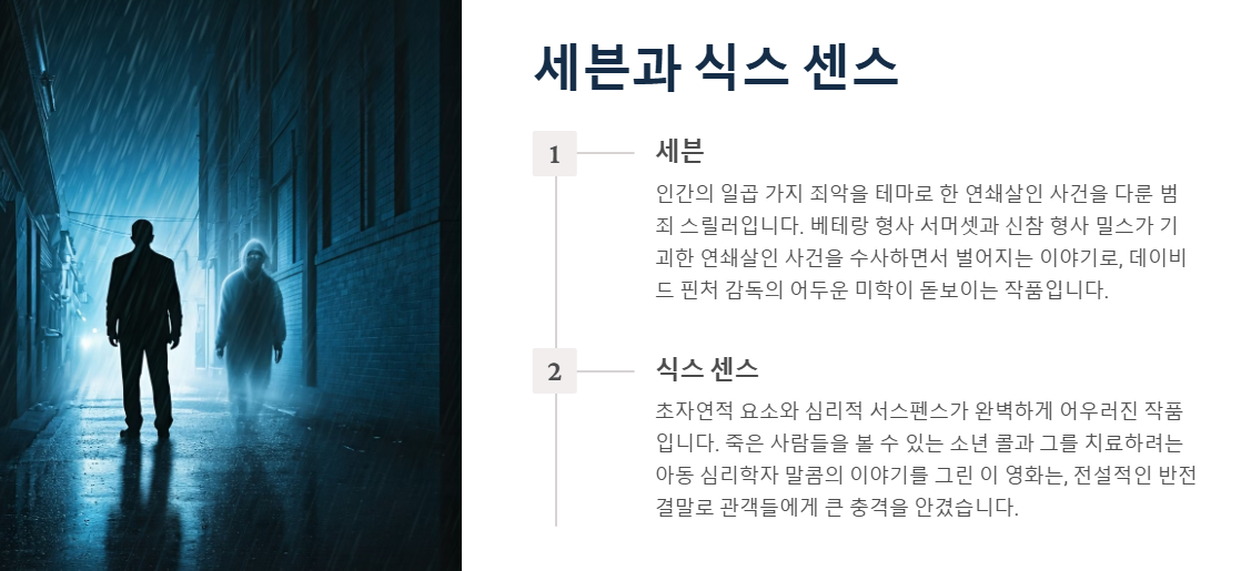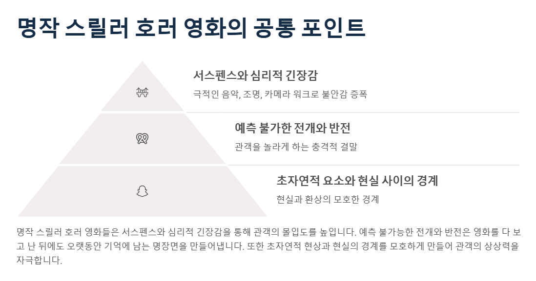 이 장르의 영화들은 종종 예상치 못한 전개와 반전을 통해 관객을 놀라게 만듭니다. 식스 센스의 결말, 세븐의 충격적인 마지막 상자, 곡성의 진실을 알 수 없는 결론 등은 영화를 다 보고 난 뒤에도 오랫동안 기억에 남는 명장면들입니다. 이러한 반전은 단순한 놀람을 넘어, 인간의 본능과 심리에 대한 질문을 던지며 관객들로 하여금 영화에 대해 다시 생각해보게 만듭니다.