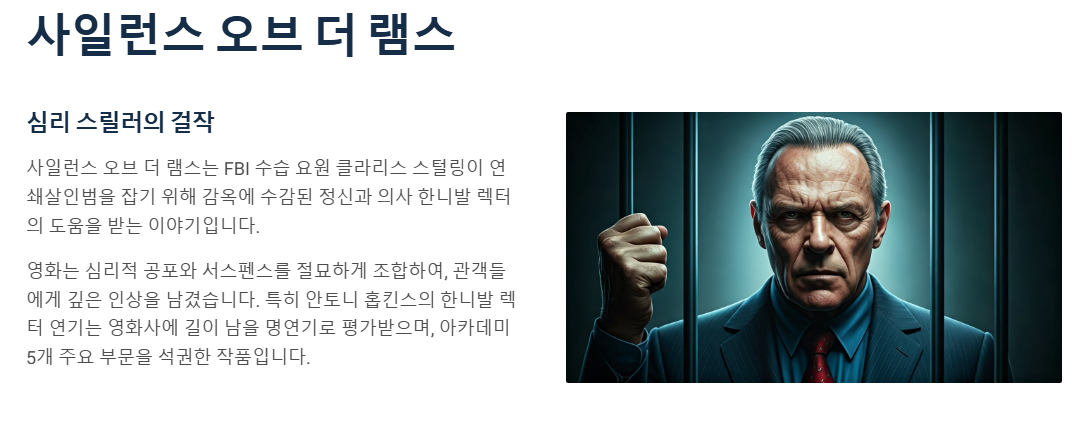 사일런스 오브 더 램스는 심리 스릴러의 걸작으로, 한니발 렉터라는 캐릭터를 통해 인간의 내면에 숨겨진 악을 탐구합니다. FBI 수습 요원 클라리스 스털링이 연쇄살인범을 잡기 위해 감옥에 수감된 정신과 의사 한니발 렉터의 도움을 받는 이야기입니다. 영화는 심리적 공포와 서스펜스를 절묘하게 조합하여, 관객들에게 깊은 인상을 남겼습니다. 특히 안토니 홉킨스의 한니발 렉터 연기는 영화사에 길이 남을 명연기로 평가받으며, 아카데미 5개 주요 부문을 석권한 작품입니다.