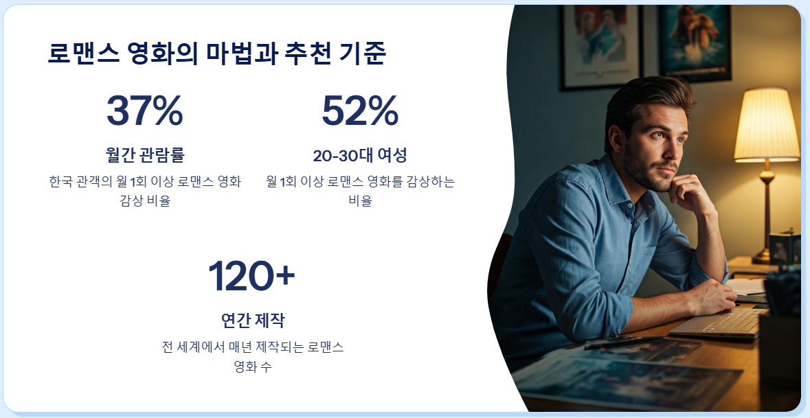 최근 한국영화진흥위원회의 조사에 따르면, 한국 관객의 37%가 월 1회 이상 로맨스 영화를 감상하며, 특히 20-30대 여성의 경우 이 비율이 52%에 달합니다. 이러한 수요를 반영해 매년 평균 120편 이상의 로맨스 영화가 전 세계에서 제작되고 있습니다.