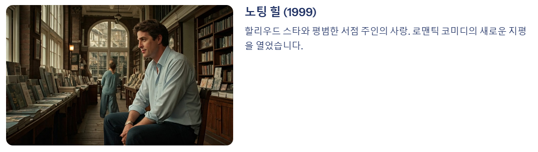할리우드 스타와 평범한 서점 주인의 사랑을 다룬 이 영화는 현실과 판타지의 경계를 절묘하게 조율했습니다. 휴 그랜트와 줄리아 로버츠의 케미스트리는 로맨틱 코미디 장르의 새로운 지평을 열었으며, 특히 영화 속 "평범한 남자"의 시선이 주는 공감대 형성이 탁월합니다.