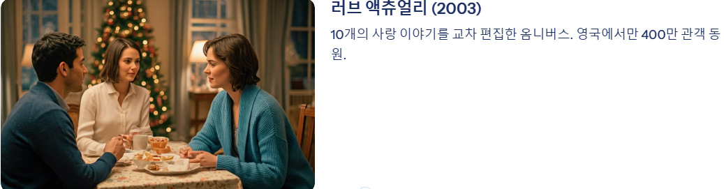 크리스마스 시즌이면 꼭 다시 보게 되는 이 영화는 10개의 사랑 이야기를 교차 편집한 옴니버스 형식을 취했습니다. 영국에서만 400만 관객을 동원하며, 다양한 형태의 사랑(이성애, 동성애, 불륜, 순수한 사랑 등)을 포용적으로 조명한 점이 높이 평가받았습니다.