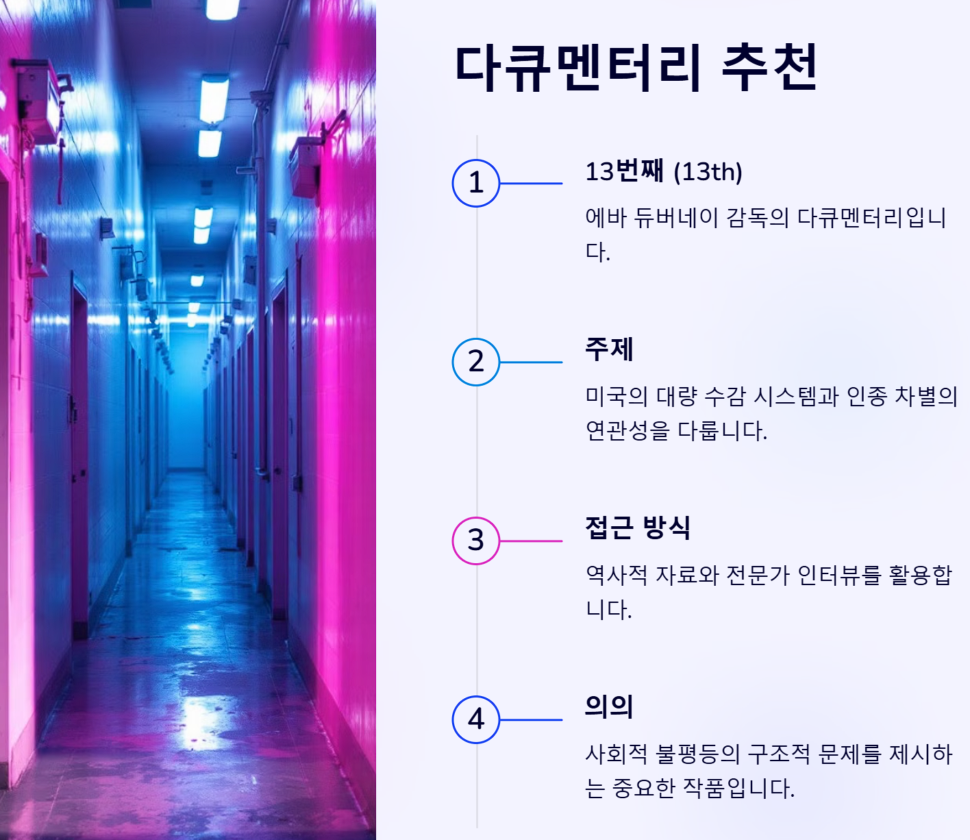 에바 듀버네이 감독의 이 작품은 미국의 대량 수감 시스템과 인종 차별의 연관성을 날카롭게 파헤칩니다. 역사적 자료와 전문가 인터뷰를 통해 사회적 불평등의 구조적 문제를 제시하는 중요한 다큐멘터리입니다.