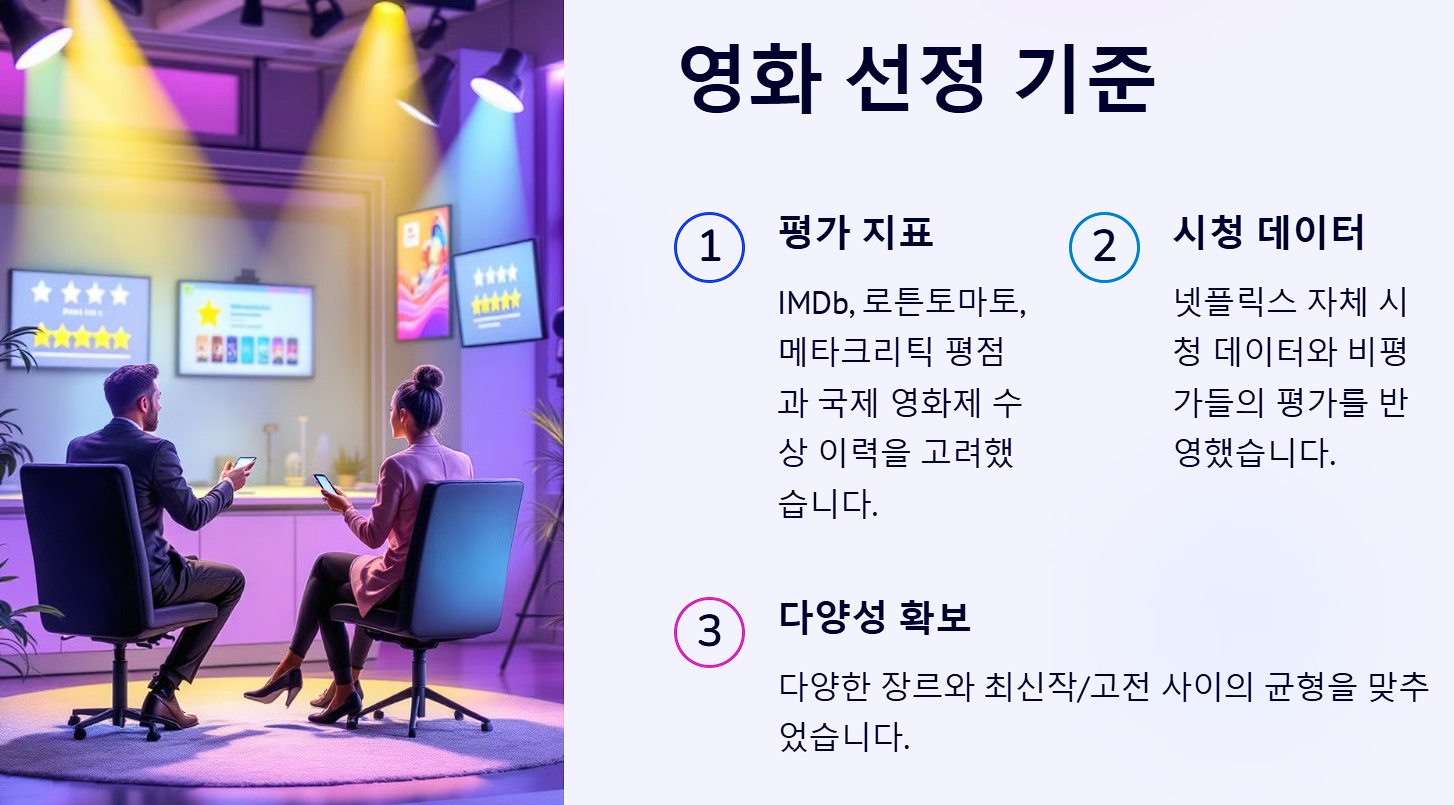 이 TOP 7 목록은 단순한 인기도를 넘어 여러 객관적 지표를 종합적으로 고려했습니다. IMDb, 로튼토마토, 메타크리틱 등의 평점, 국제 영화제 수상 이력, 넷플릭스 자체 시청 데이터, 비평가들의 평가, 그리고 문화적 중요성을 기준으로 삼았습니다. 또한 다양한 취향을 만족시키기 위해 장르적 다양성을 확보하고, 최신작과 고전 사이의 균형을 맞추고자 했습니다.