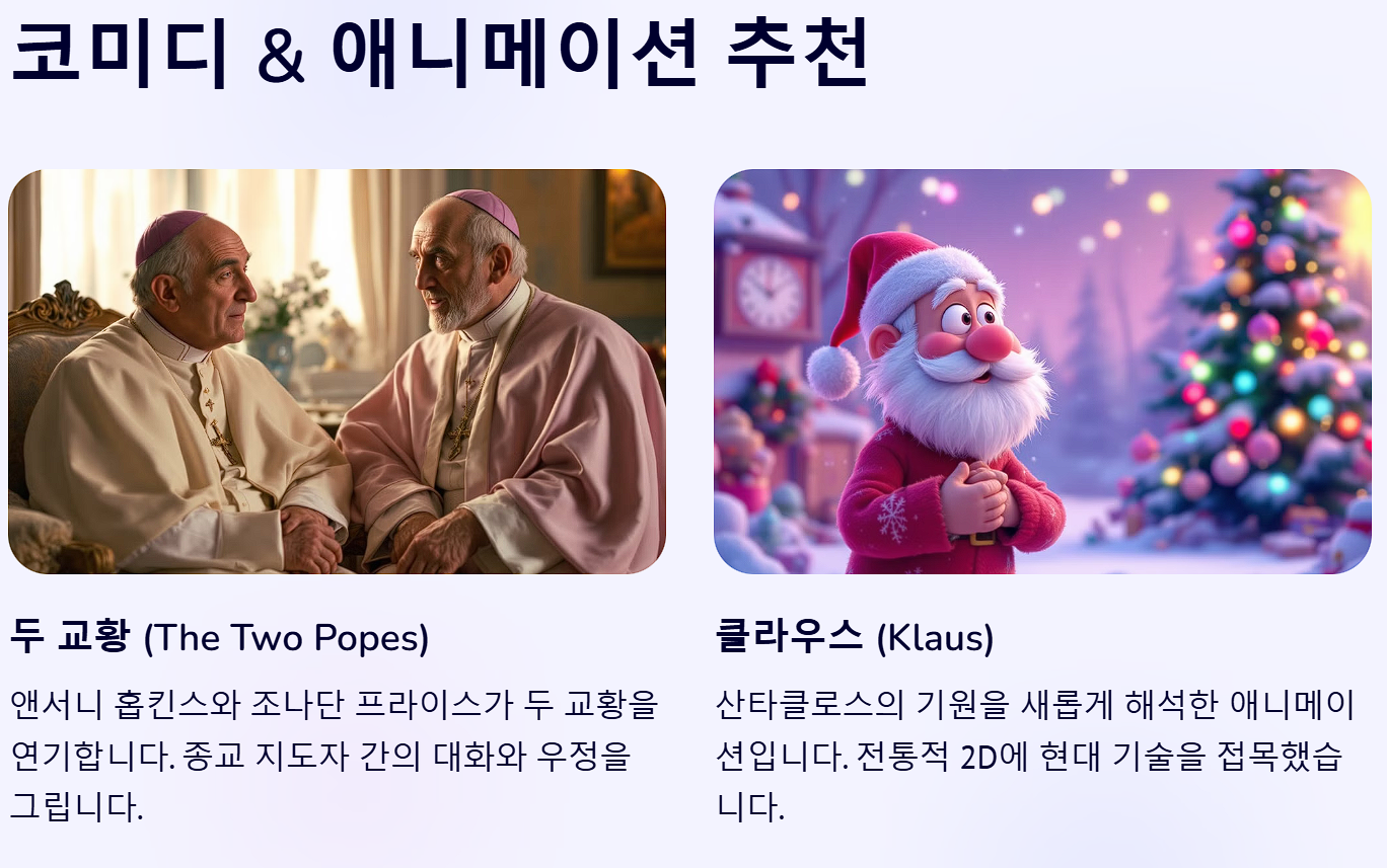 앤서니 홉킨스와 조나단 프라이스가 각각 베네딕트 16세와 프란치스코 교황을 연기하며, 두 종교 지도자 간의 대화와 우정을 유머러스하면서도 깊이 있게 그려냅니다. 무거운 주제를 다루면서도 유머와 위트를 잃지 않는 작품입니다.