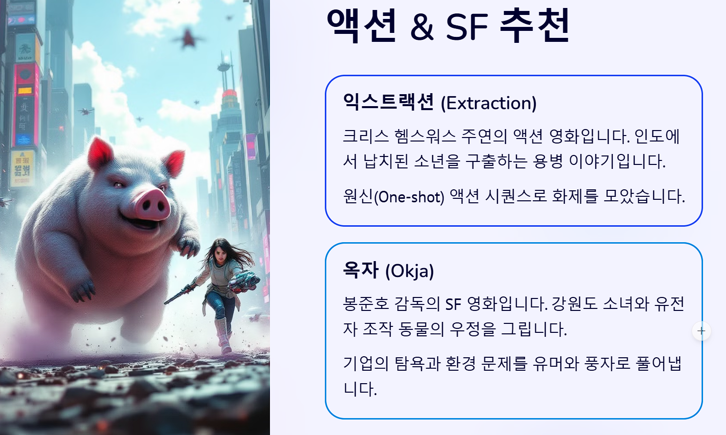 봉준호 감독의 이 작품은 강원도 소녀와 유전자 조작 동물 옥자의 우정을 그린 SF 영화입니다. 기업의 탐욕과 환경 문제, 동물권을 봉준호 감독 특유의 유머와 풍자로 풀어냅니다. 글로벌 캐스팅과 한국적 정서가 조화를 이룬 작품입니다.
