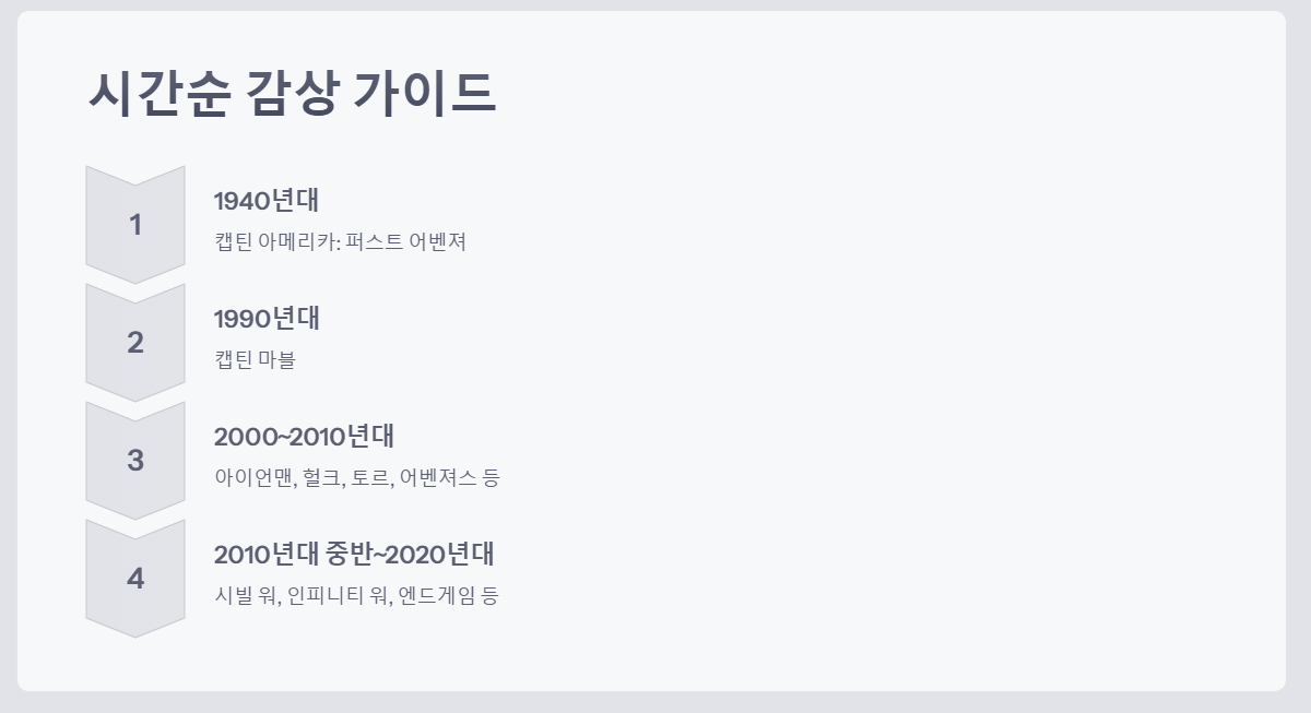 개봉 순서와 달리 MCU 내의 시간 흐름에 따라 영화를 감상하는 방법도 있습니다. 이는 캐릭터들의 역사와 세계관의 발전을 이해하는 데 도움이 됩니다.